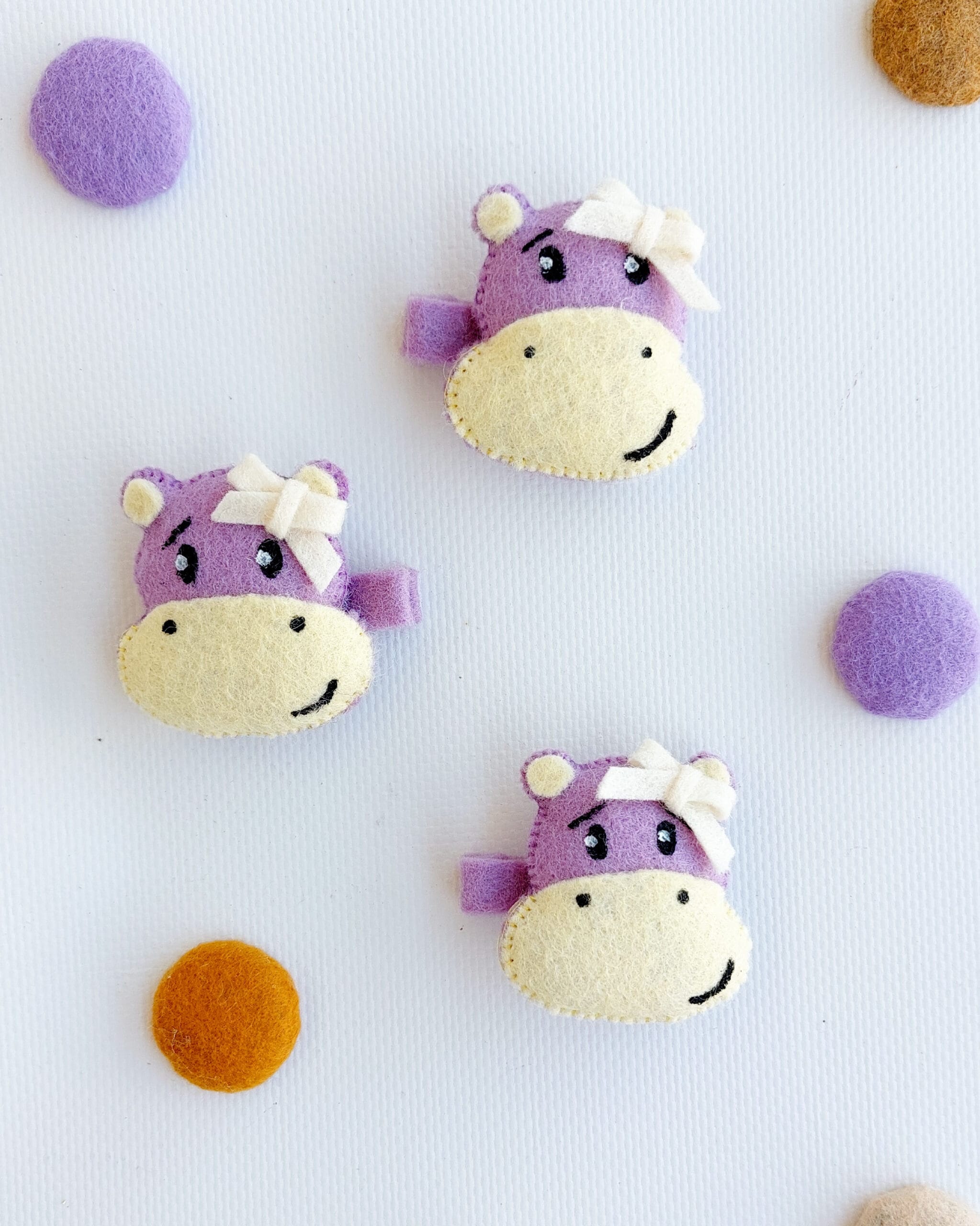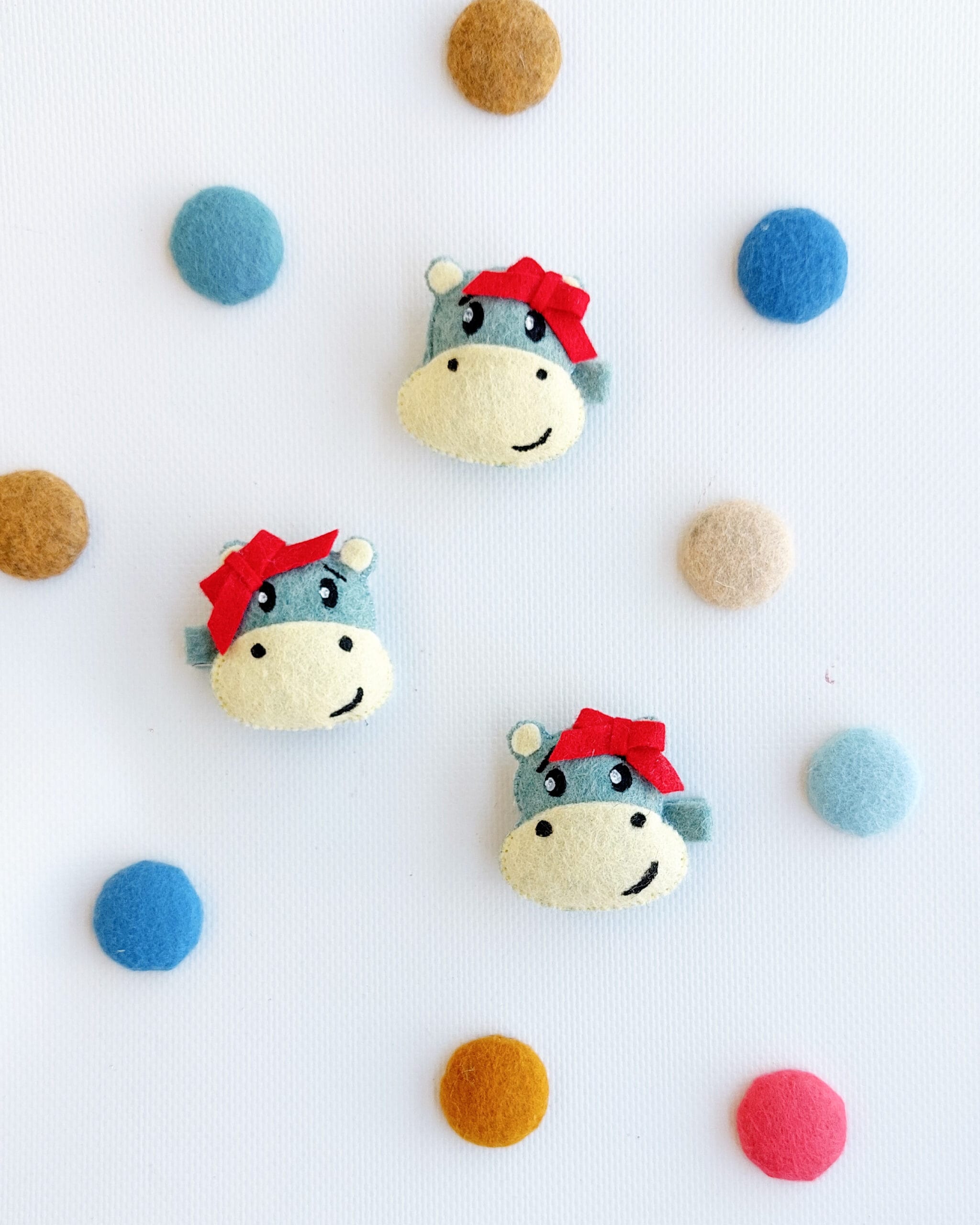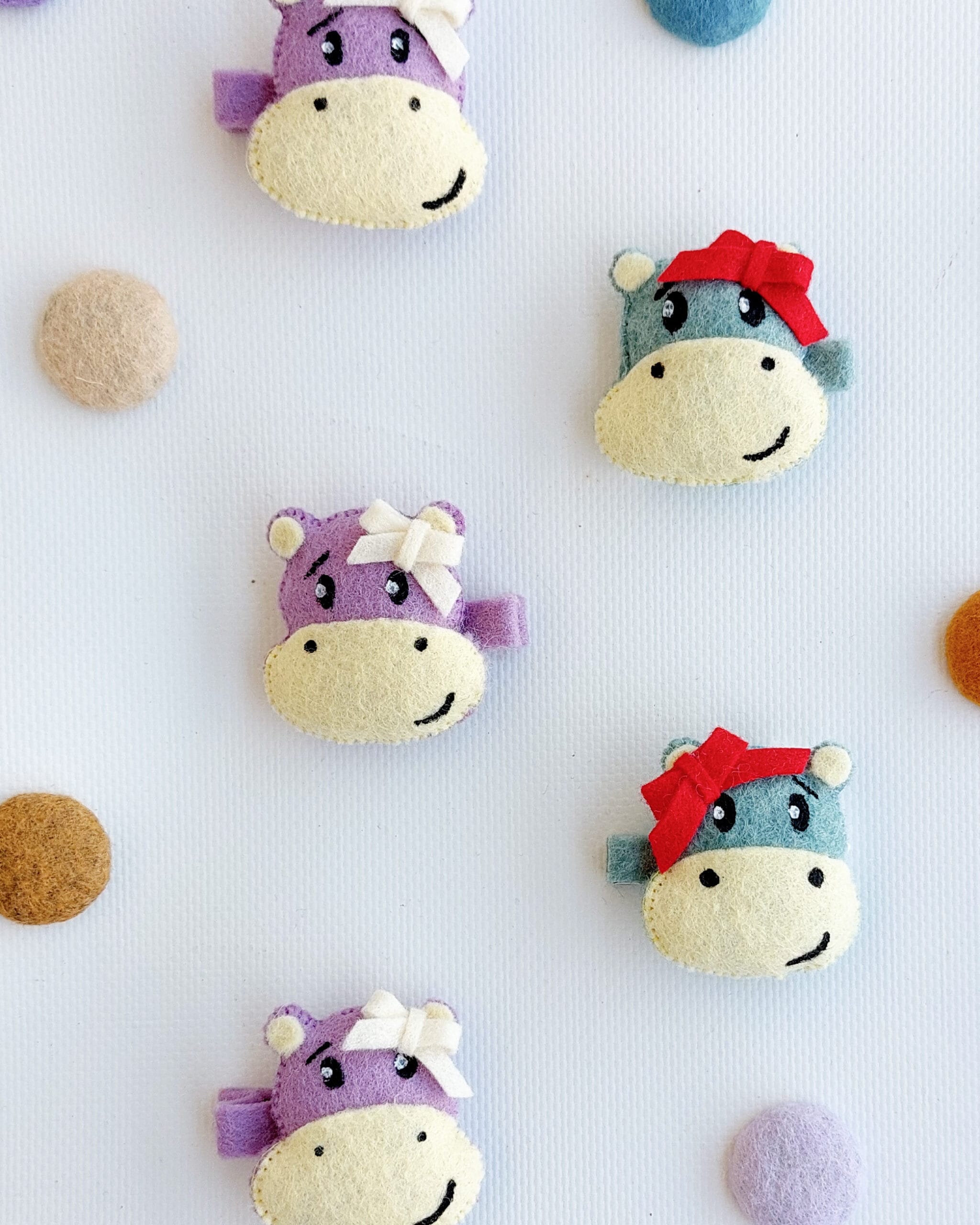 Nežna i razigrana šnalica sa veselim nilskim konjićem, ručno izrađene od filca sa pažljivo oblikovanim detaljima.