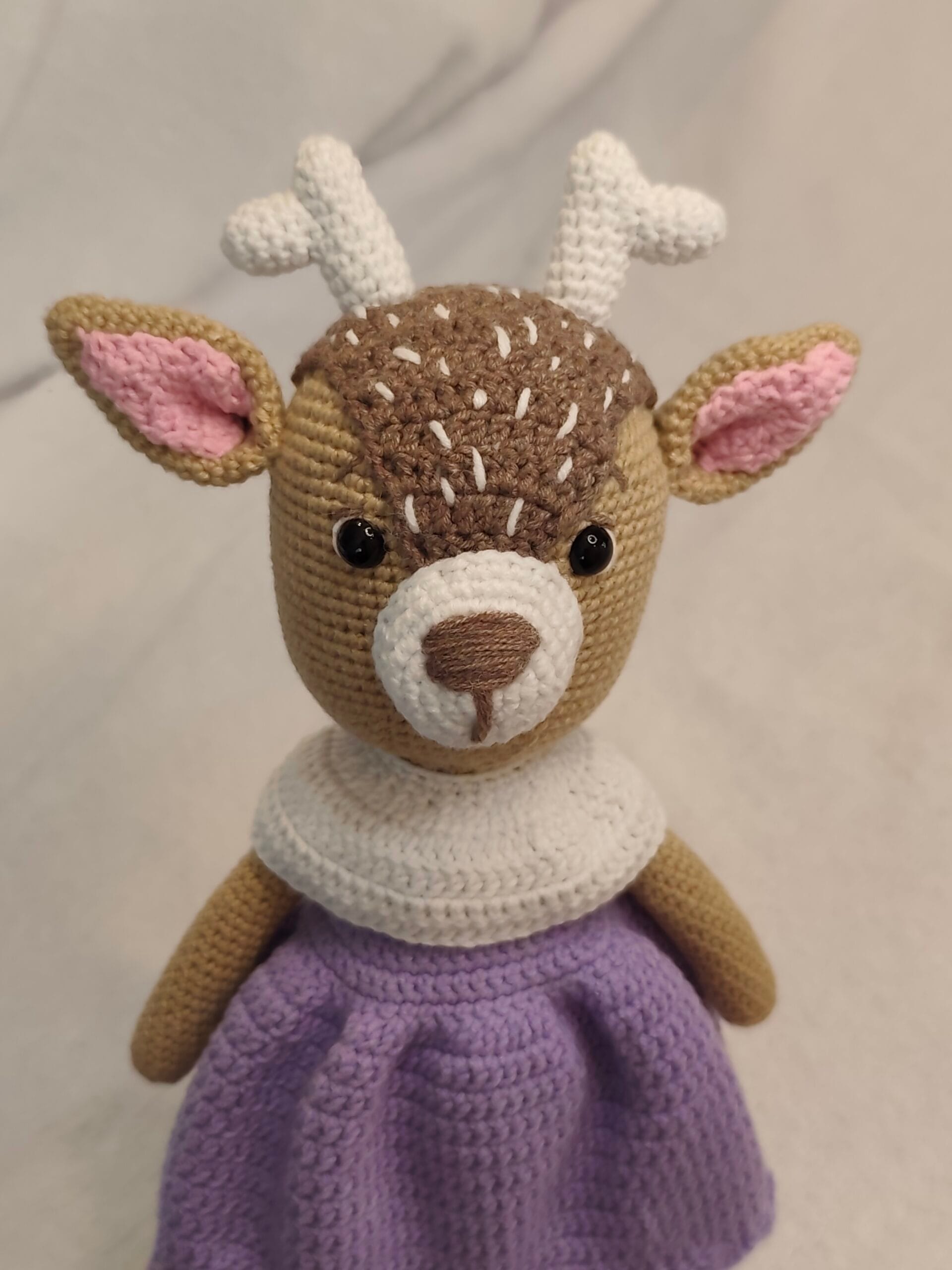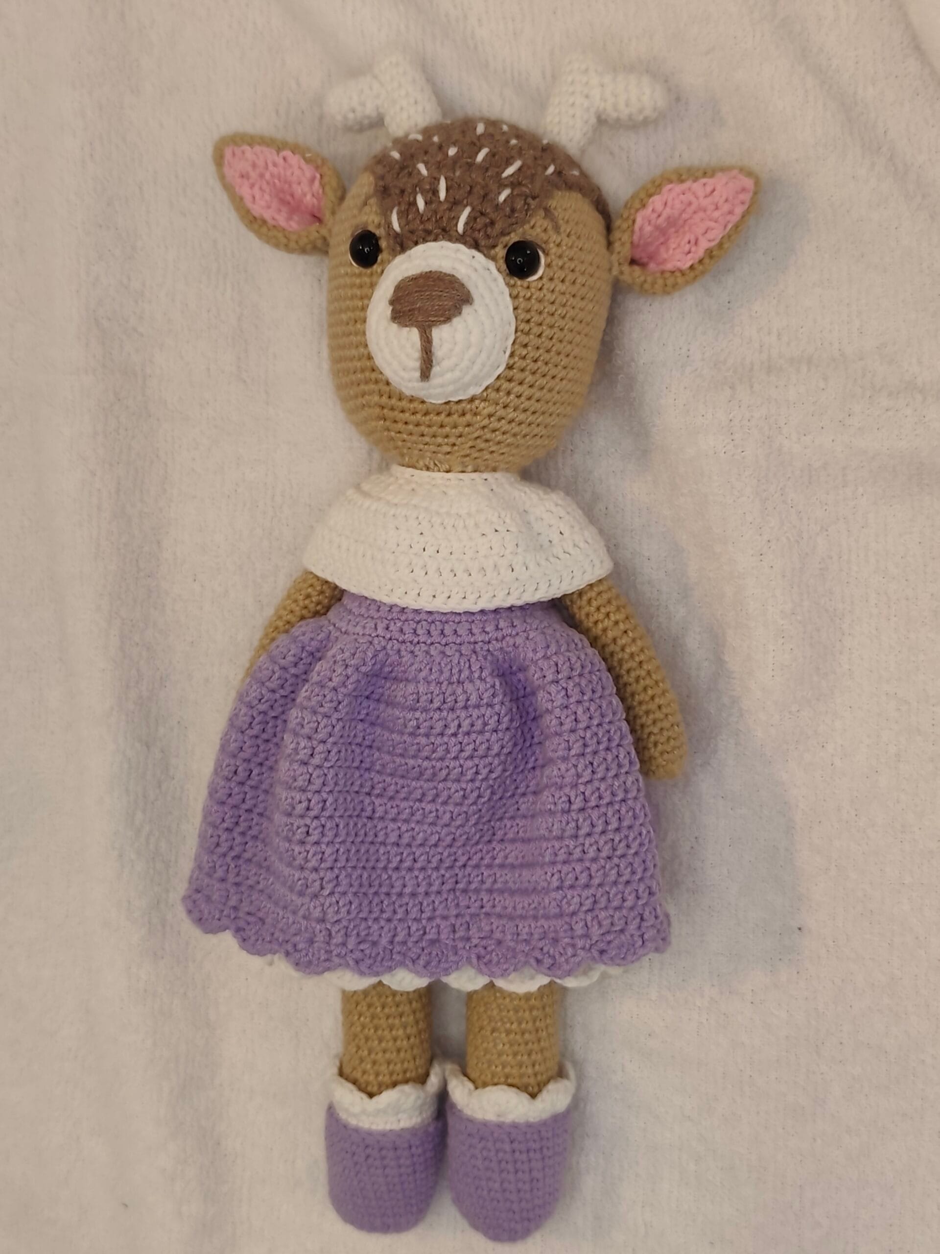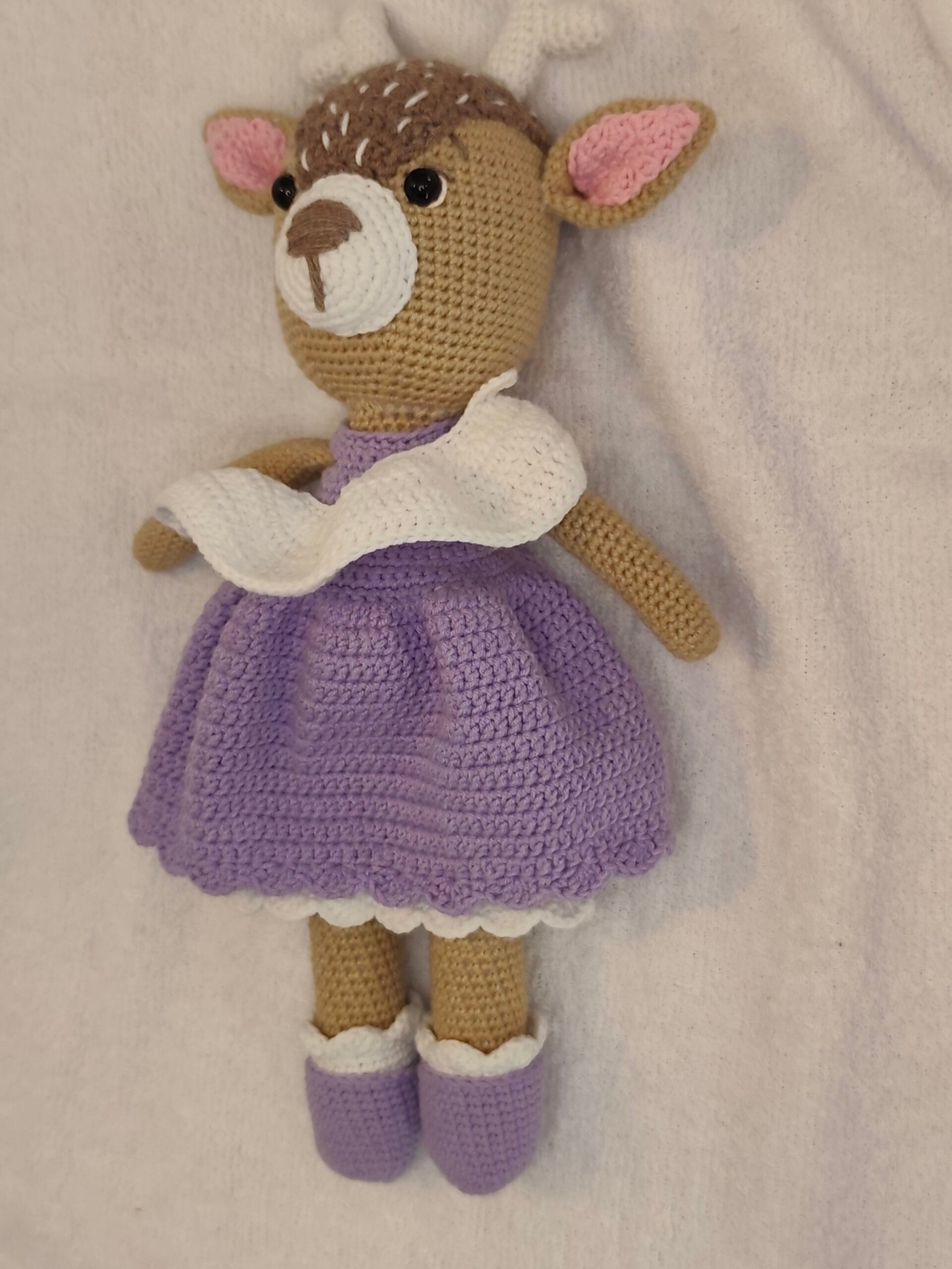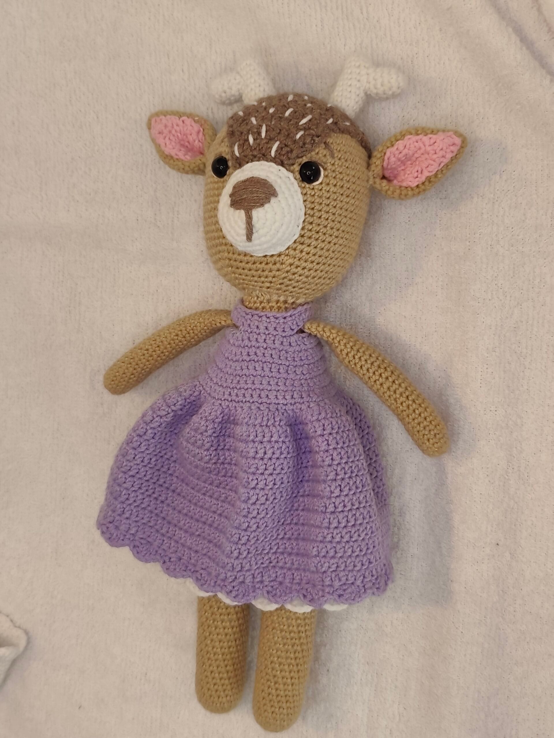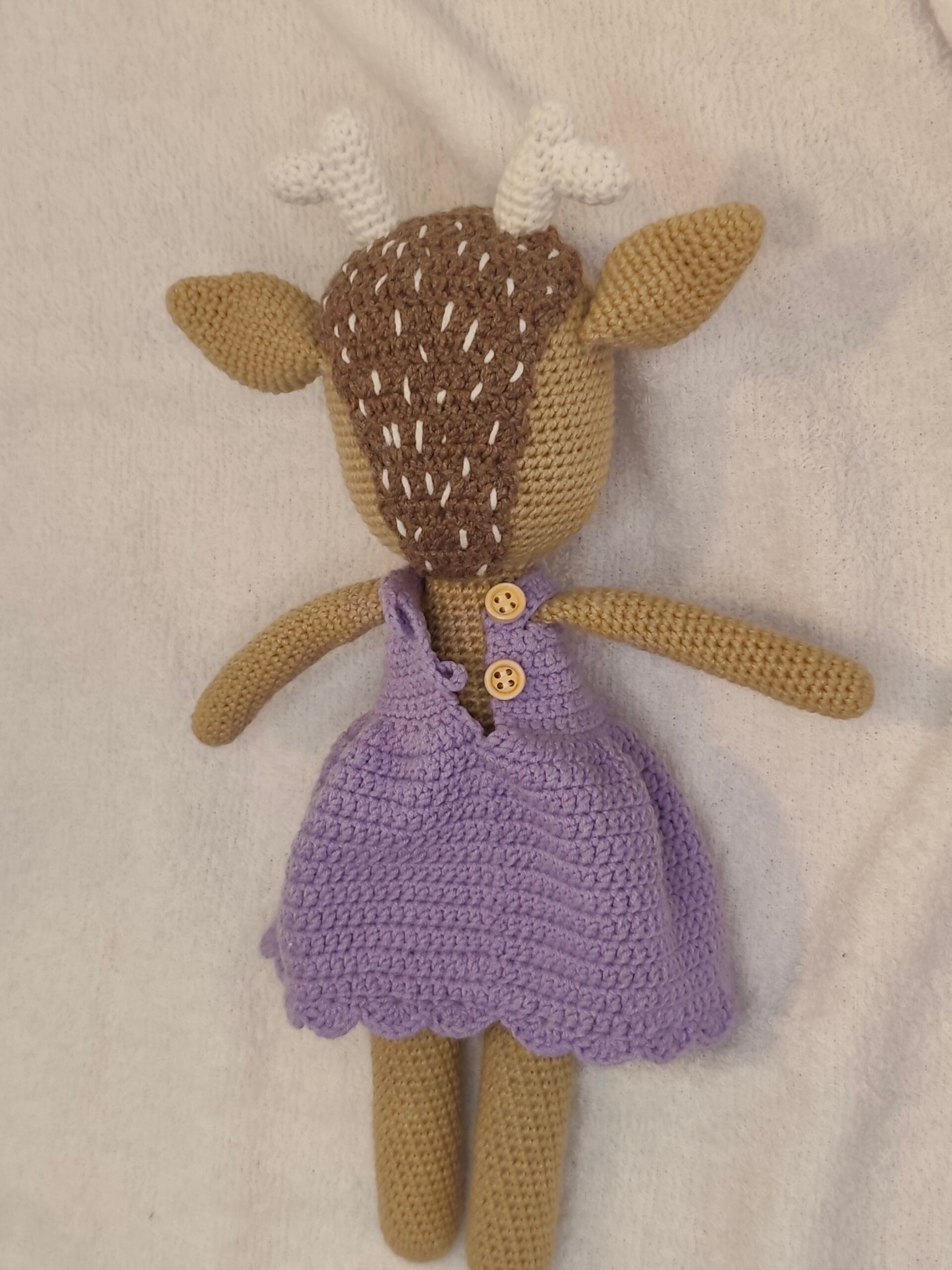 Umetnost u svakom bodu: Ručno heklana srna u ljubičastoj haljini