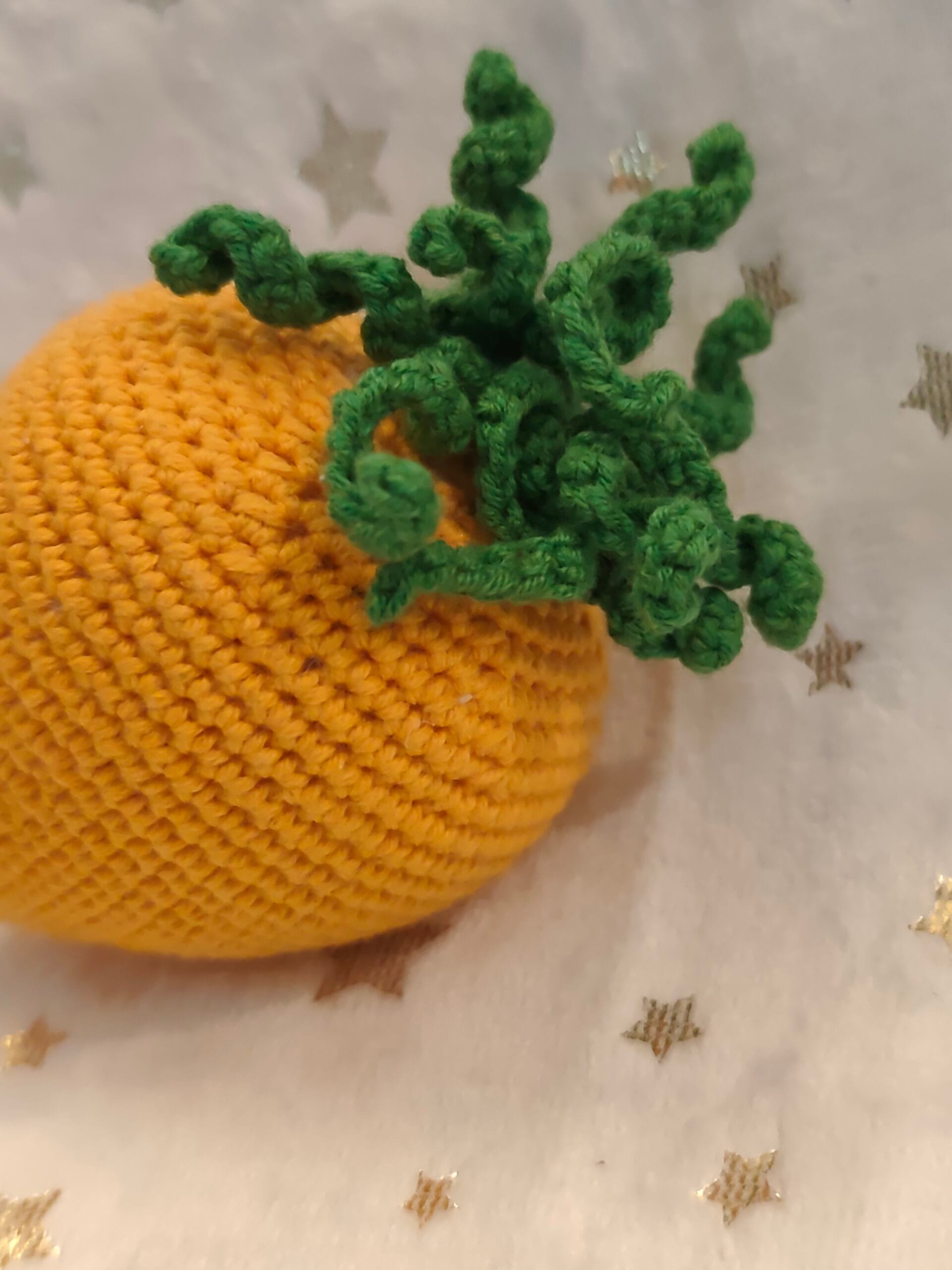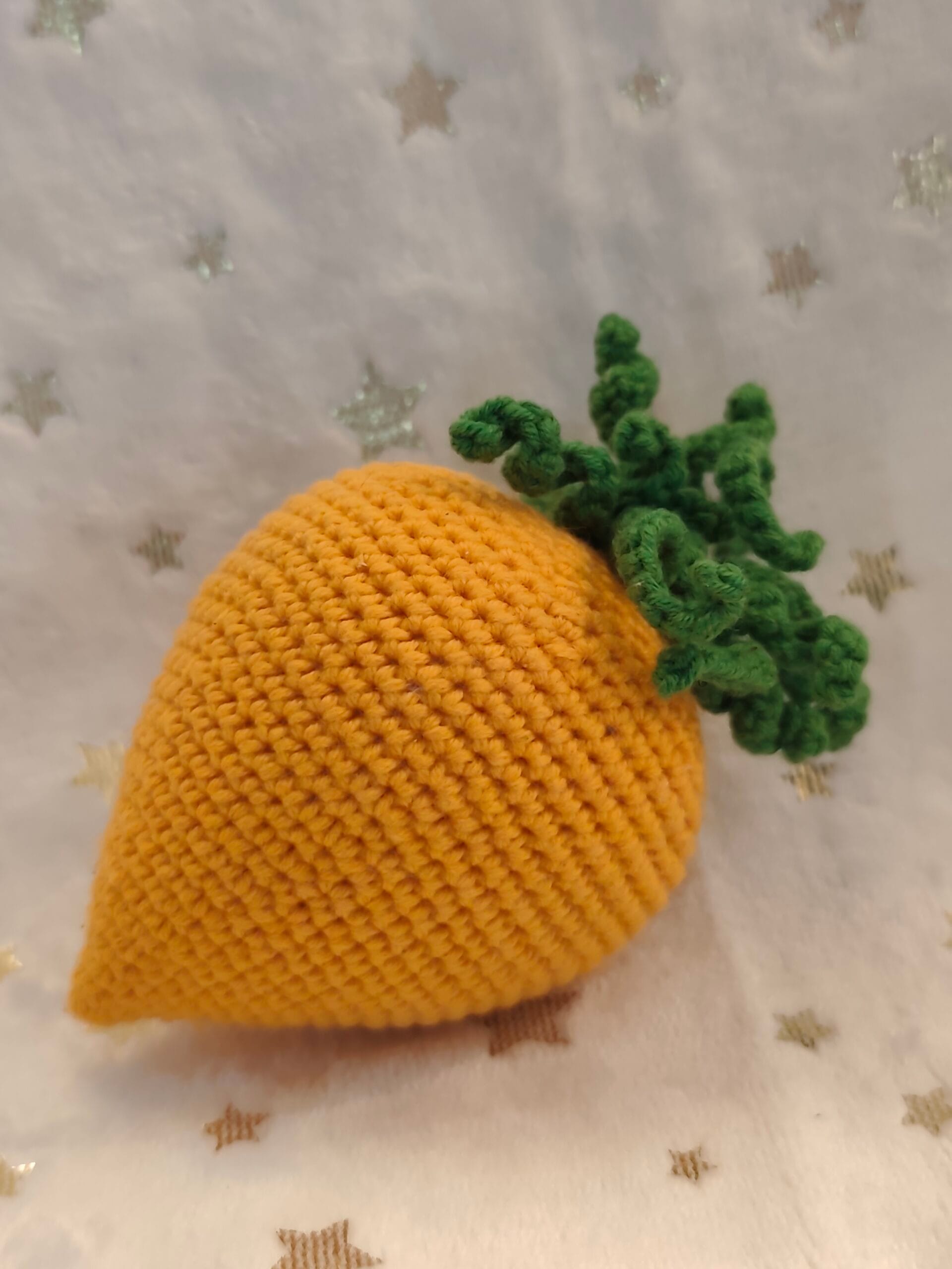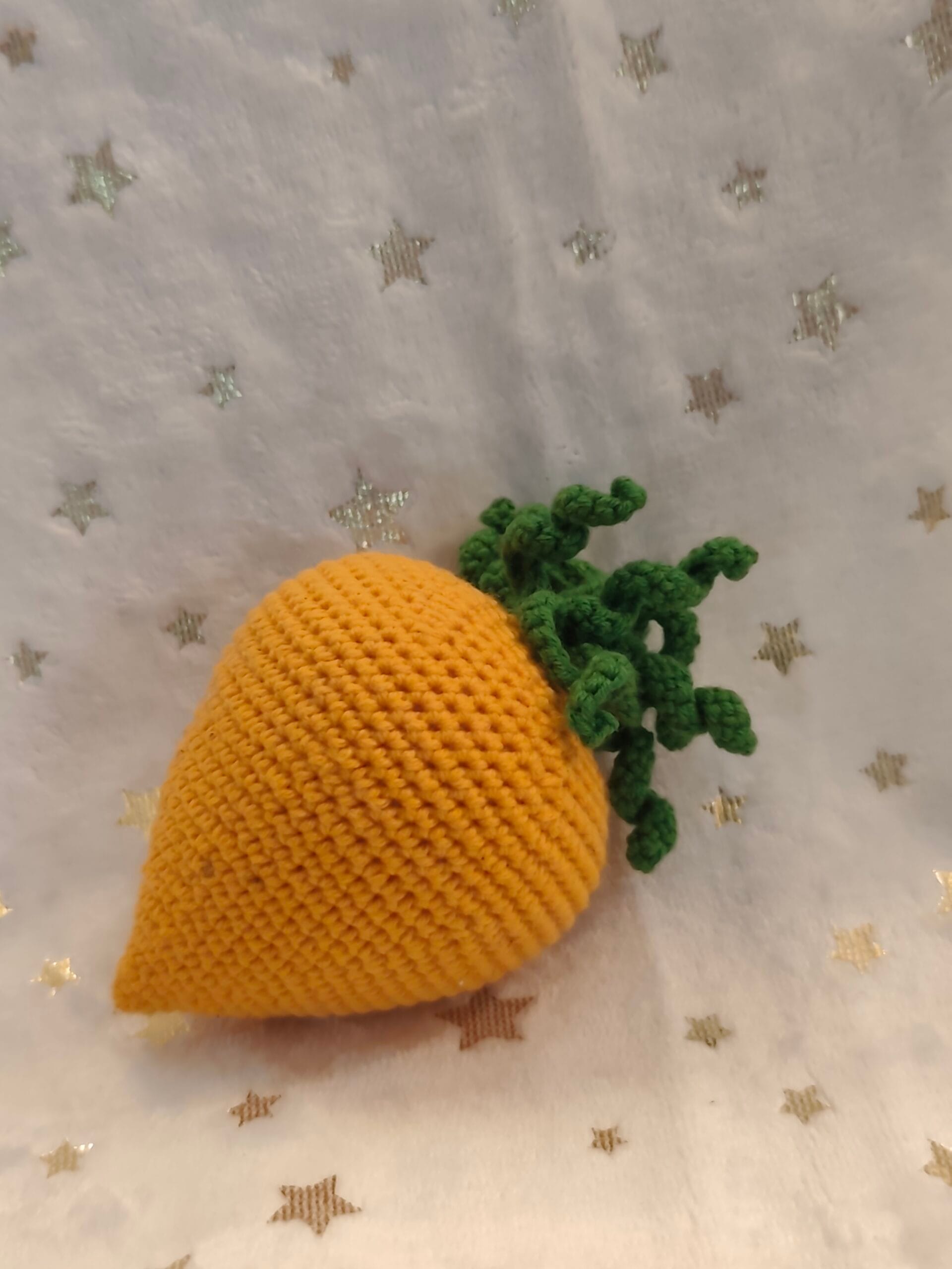 Heklana zvečkica u obliku šargarepe je nežna, prirodna i potpuno ručno izrađena igračka namenjena bebama i maloj deci. Napravljena je od kvalitetnog pamučnog konca i punjena mekanim punjenjem, što je čini prijatnom za držanje, stiskanje i istraživanje.