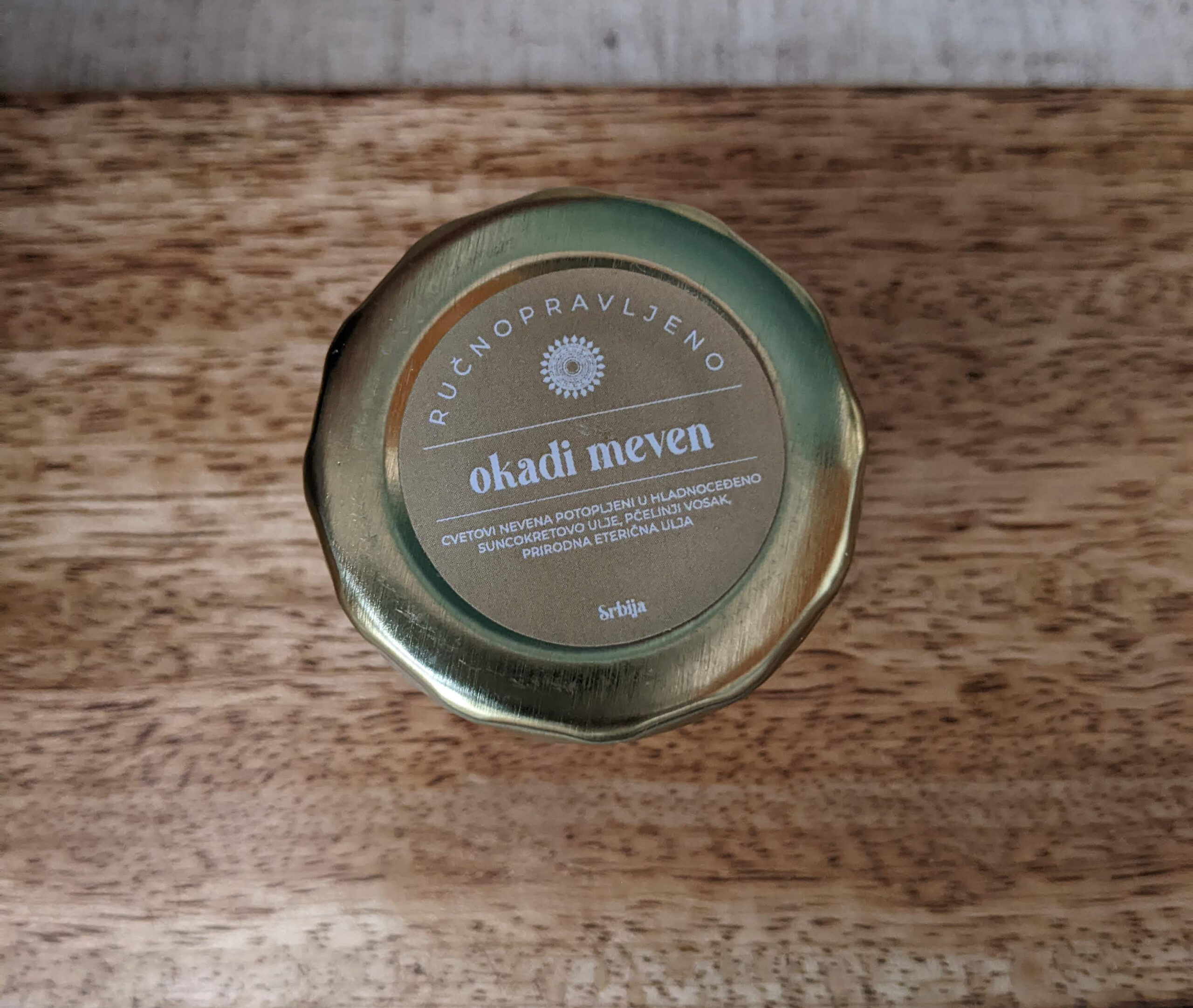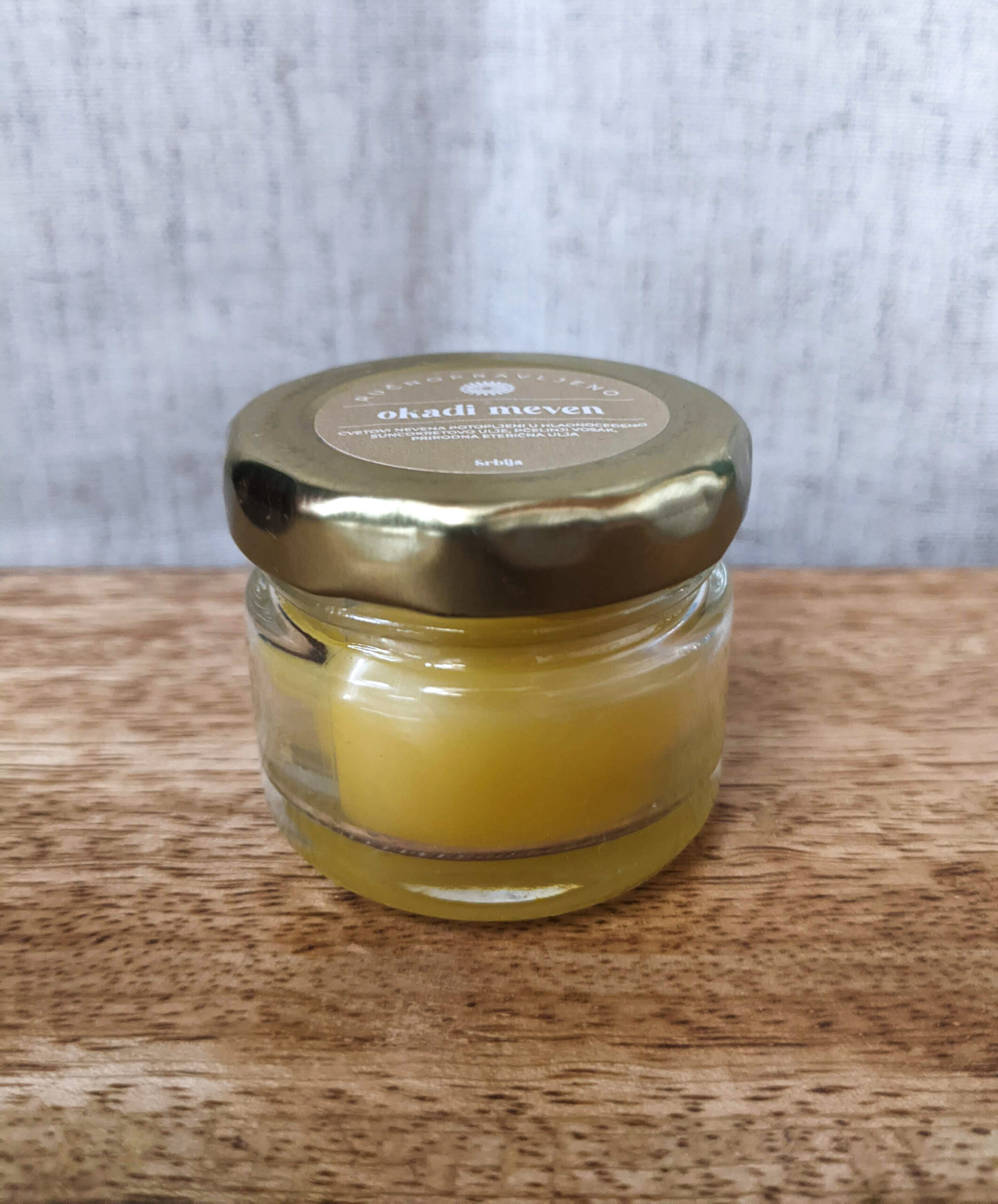 Sastav: cvetovi nevena, hladno ceđeno suncokretovo ulje, pčelinji vosak, prirodno eterično ulje mandarine, limuna i lavande