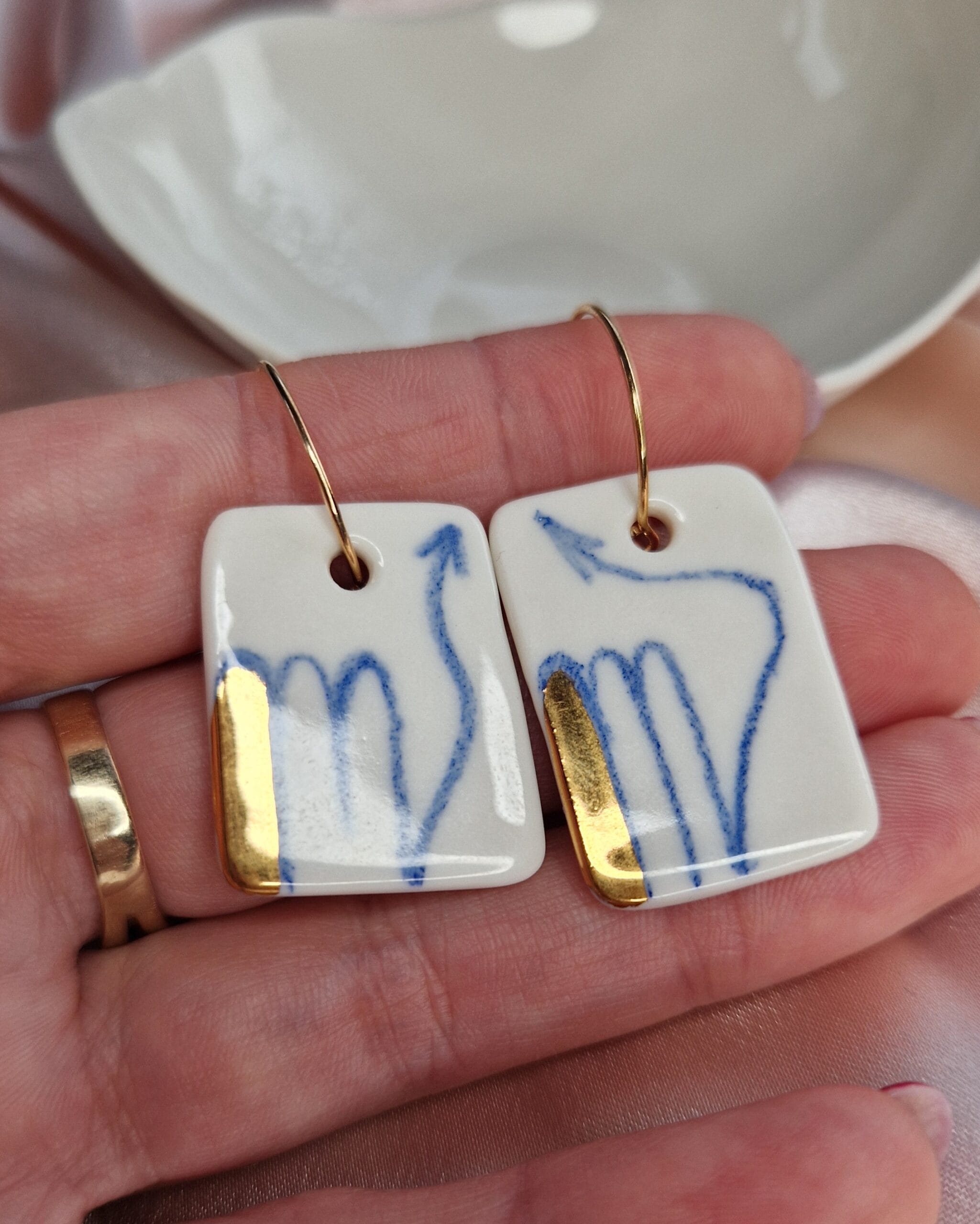 Svaki komad nakita u Djina studiju prolazi kroz dugotrajan proces ručne izrade. Porcelan se peče na visokoj temperaturi od 1230°C, što mu daje izuzetnu čvrstinu i plemenitu belinu. Motiv škorpije je ručno slikan, a zatim dekorisan tečnim 22k zlatom koje se dodatno fiksira u trećem pečenju.