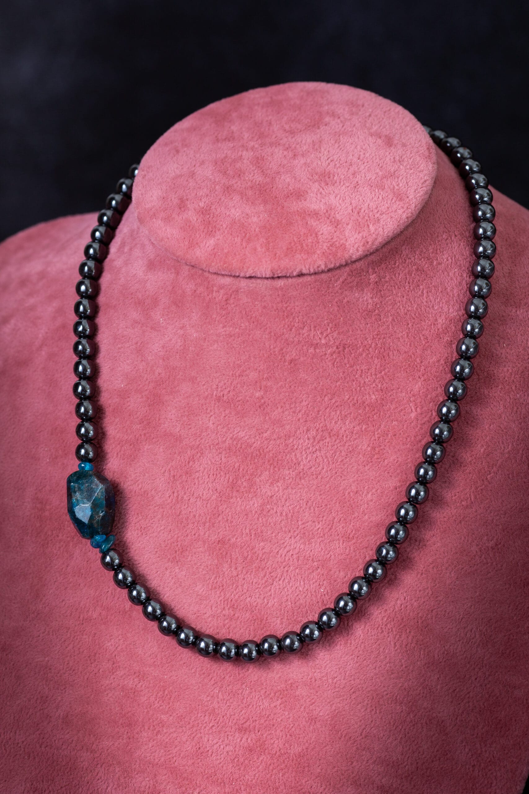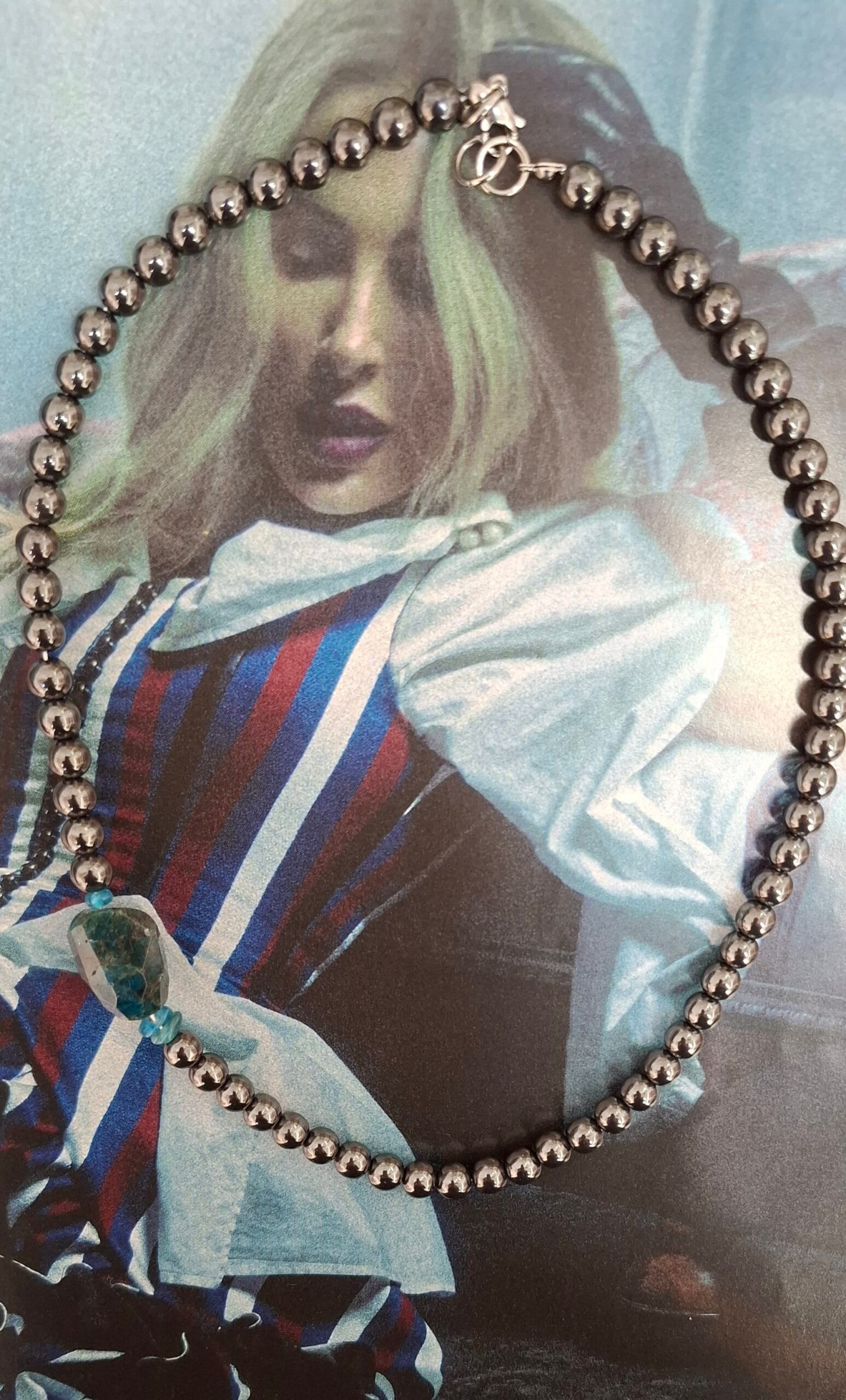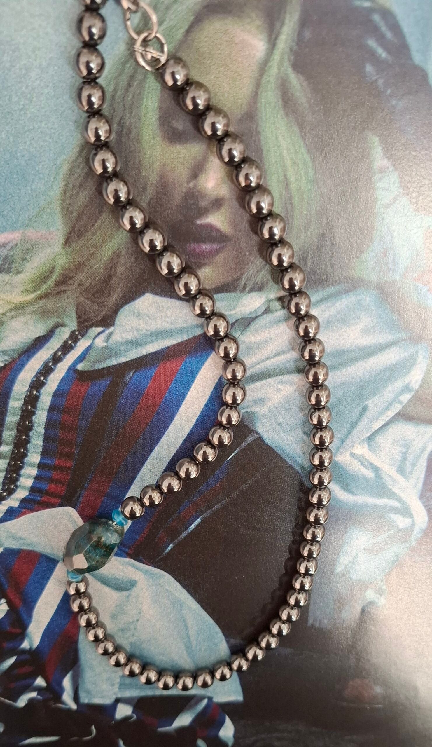 Ogrlica od hemata, uz detalj u vidu apatita – fotografije ni približno ne prenose njegovu lepotu, kamen izbliza izgleda kao svemir u malom …