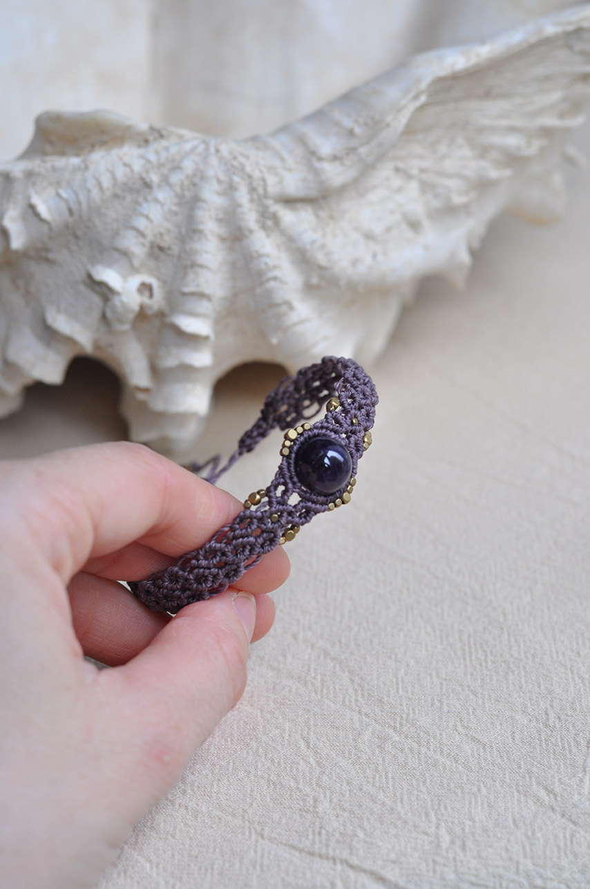 Ženska narukvica pletena tamno ljubičastim koncem, sa Ametistom i mesinganim perlicama.