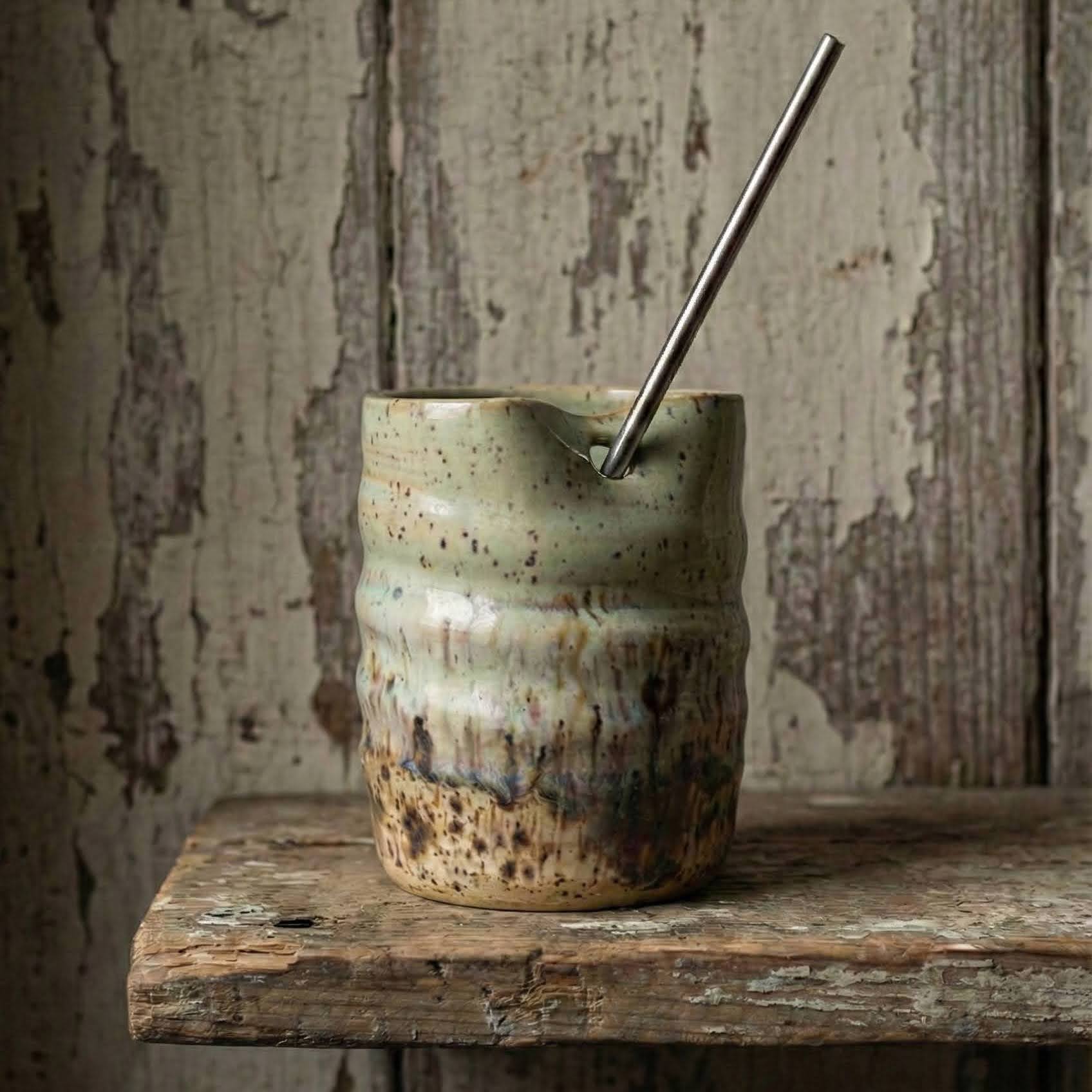 Ručno rađena keramička čaša sa otvorom za slamčicu, dizajnirana je sa akcentom na funkcionalnost i estetiku koja slavi tragove procesa. Bilo da je u pitanju ledena kafa ili osvežavajući čaj, ova čaša unosi autentičnost u tvoju svakodnevicu. Keramika je pečena na visokoj temperaturi, sigurna je u kontaktu sa hranom i pogodna za pranje u sudomašini. Zapremina šolje je ~300 ml.