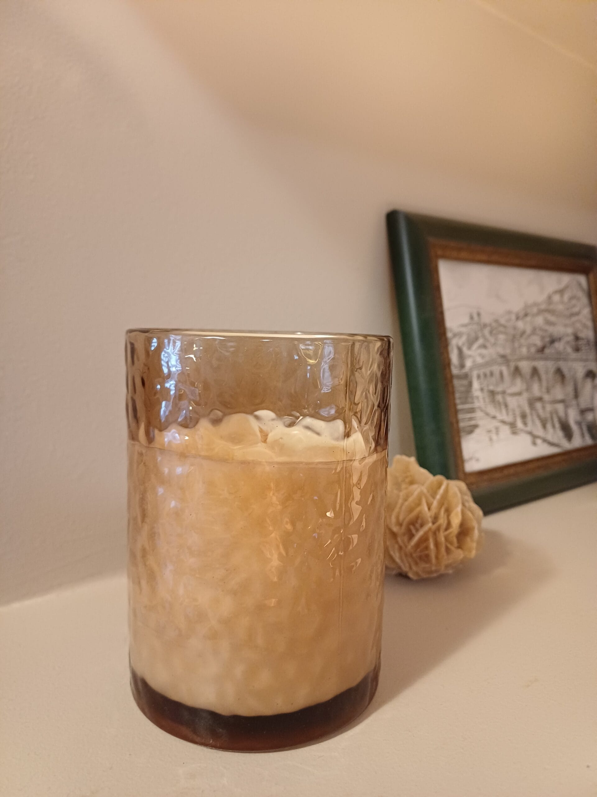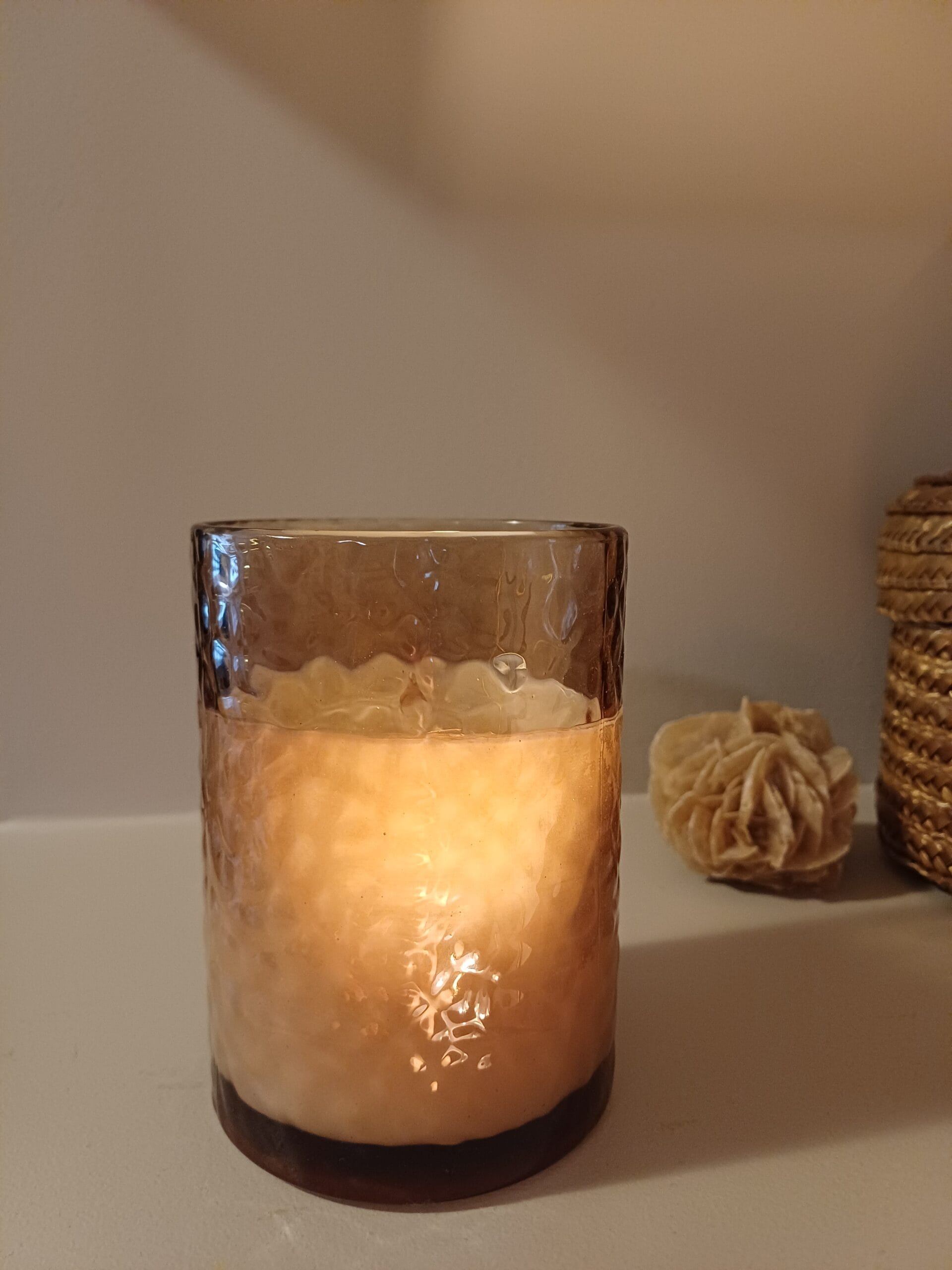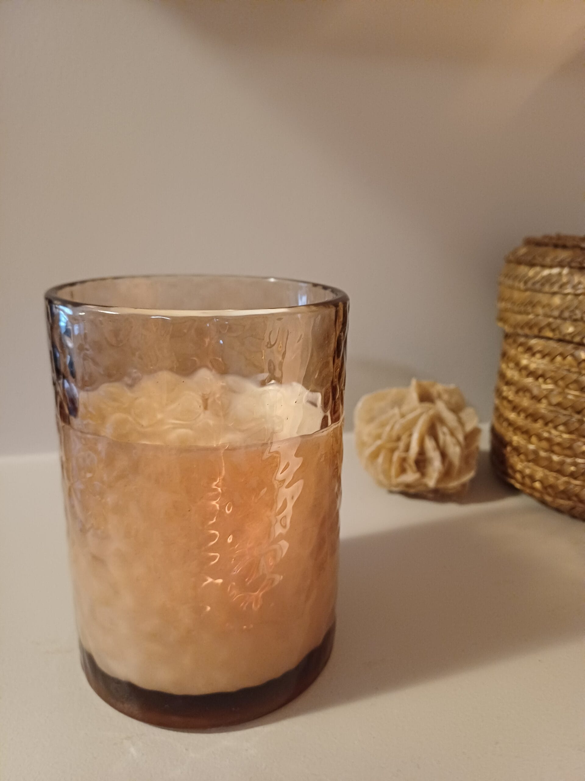 Malo drugačija klasika – sveća u čaši od čekićanog stakla predivne nijanse, idealnih 200 grama.