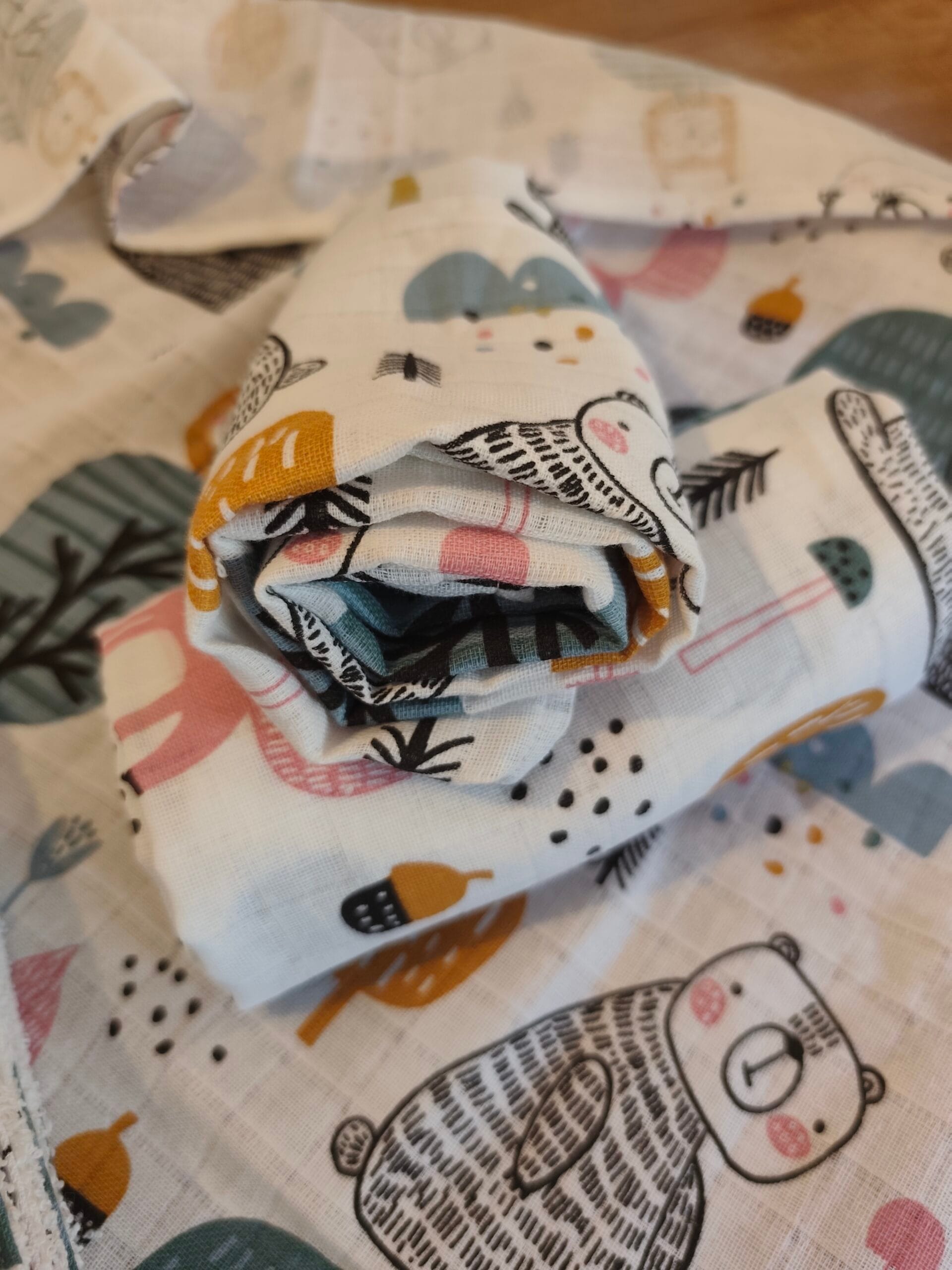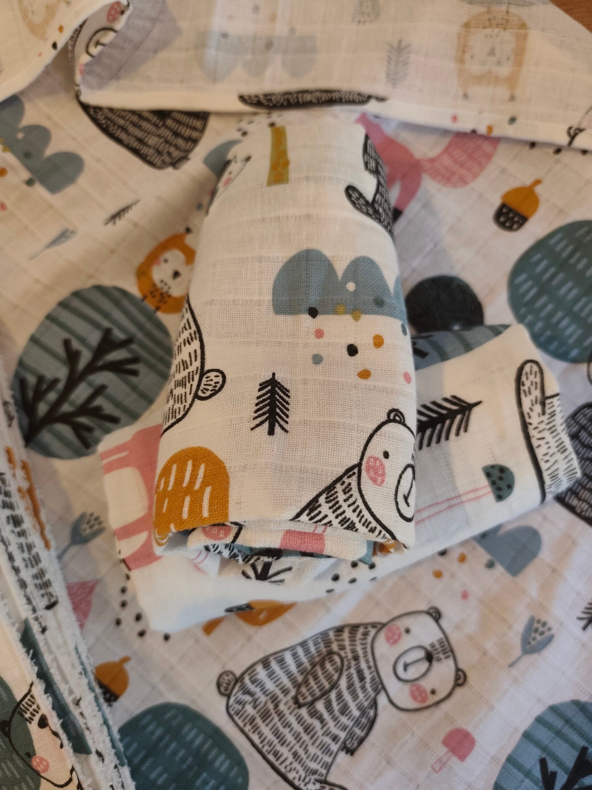 Ušuškajte svoje najmlađe u mekoću i toplinu pažljivo izrađenog bebi seta sa nežnim šumskim motivima. Set je dizajniran da pruži maksimalnu udobnost i sigurnost osetljivoj bebinoj koži, zahvaljujući prirodnim i prijatnim materijalima.