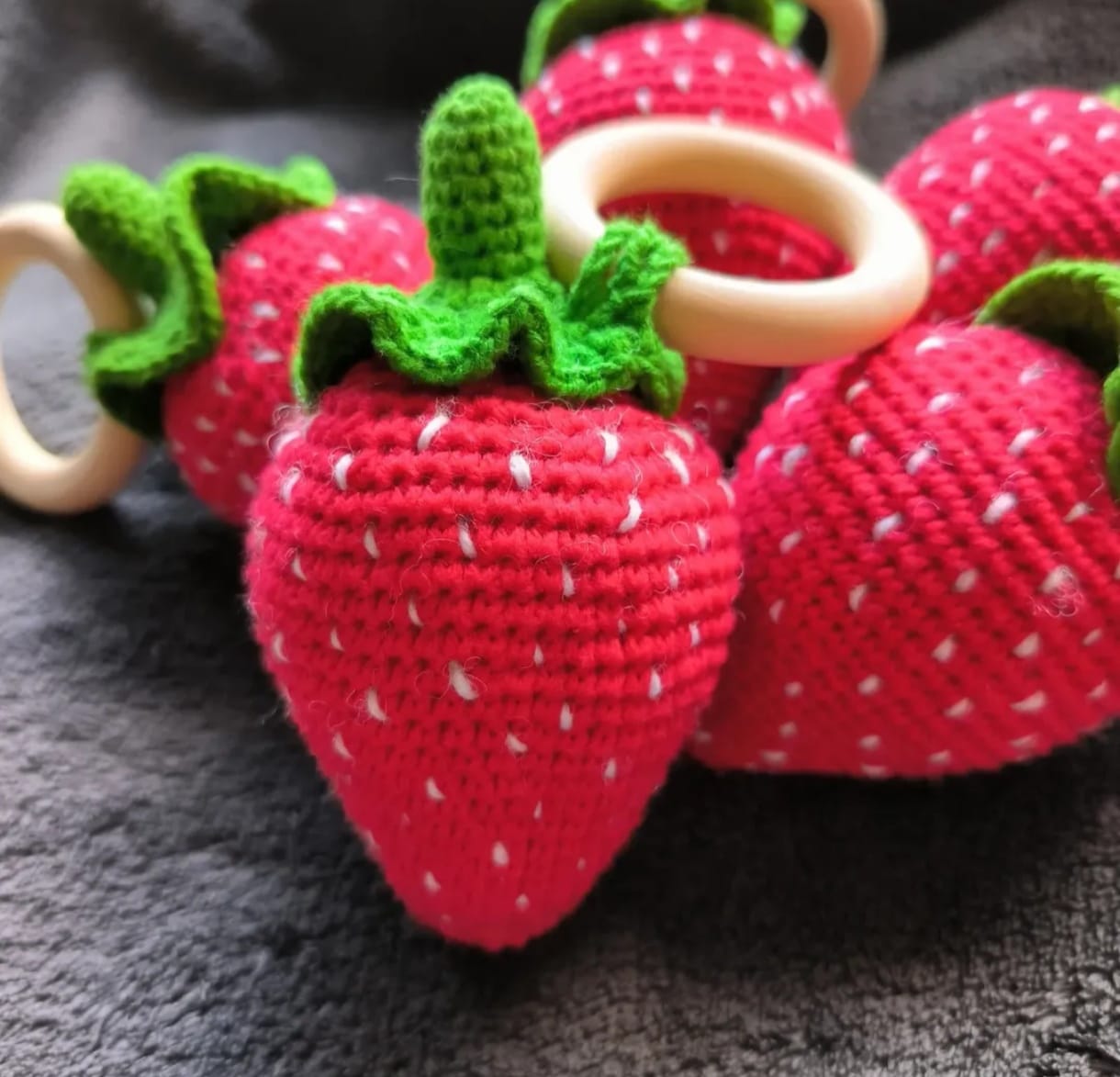 Ručno rađena heklana zvečka u obliku jagode. Izrađena je od pamučnog konca debljine 2mm. Punjena punjenjem za igračke, uz dodatak drvenog prstena.